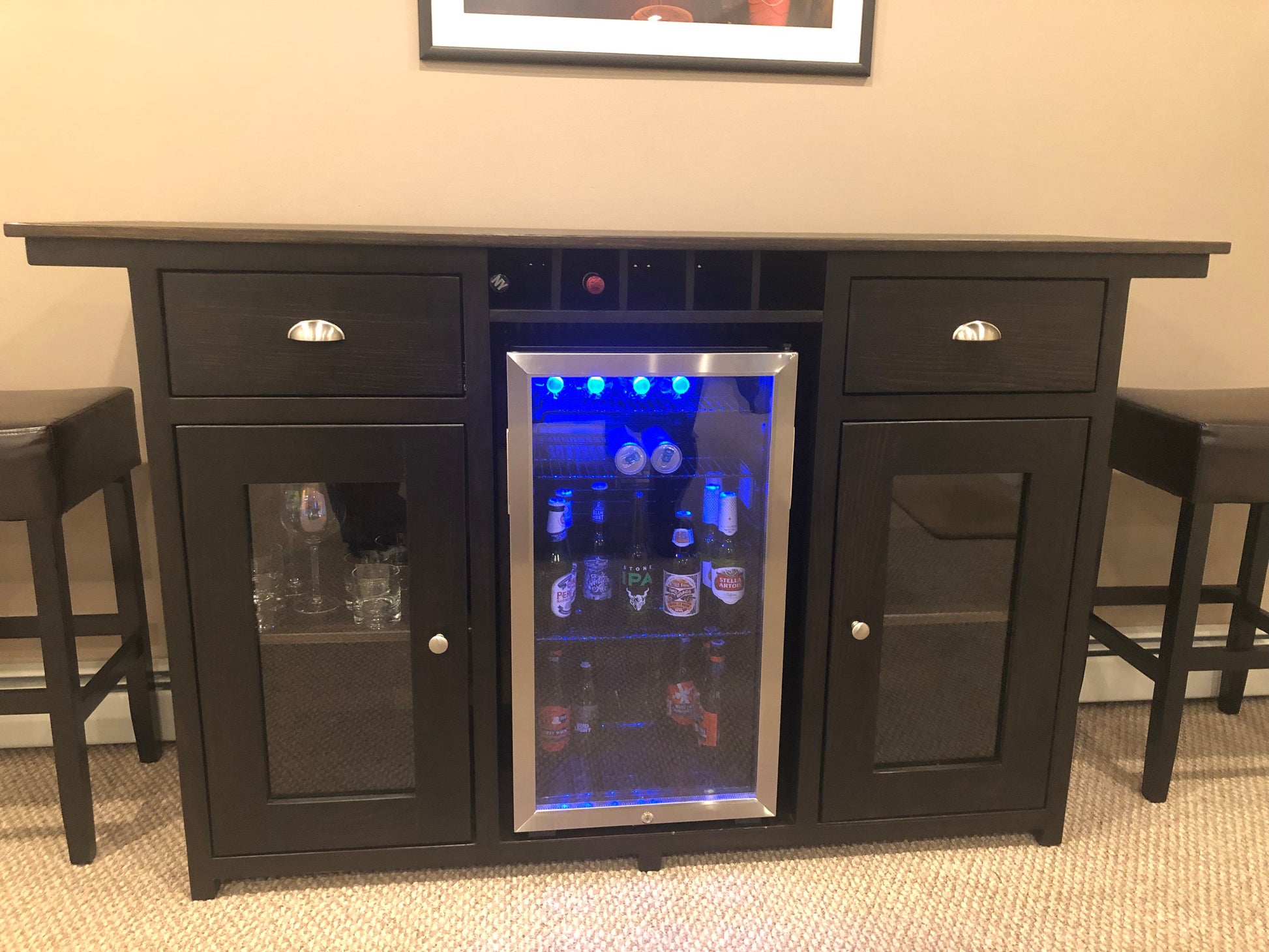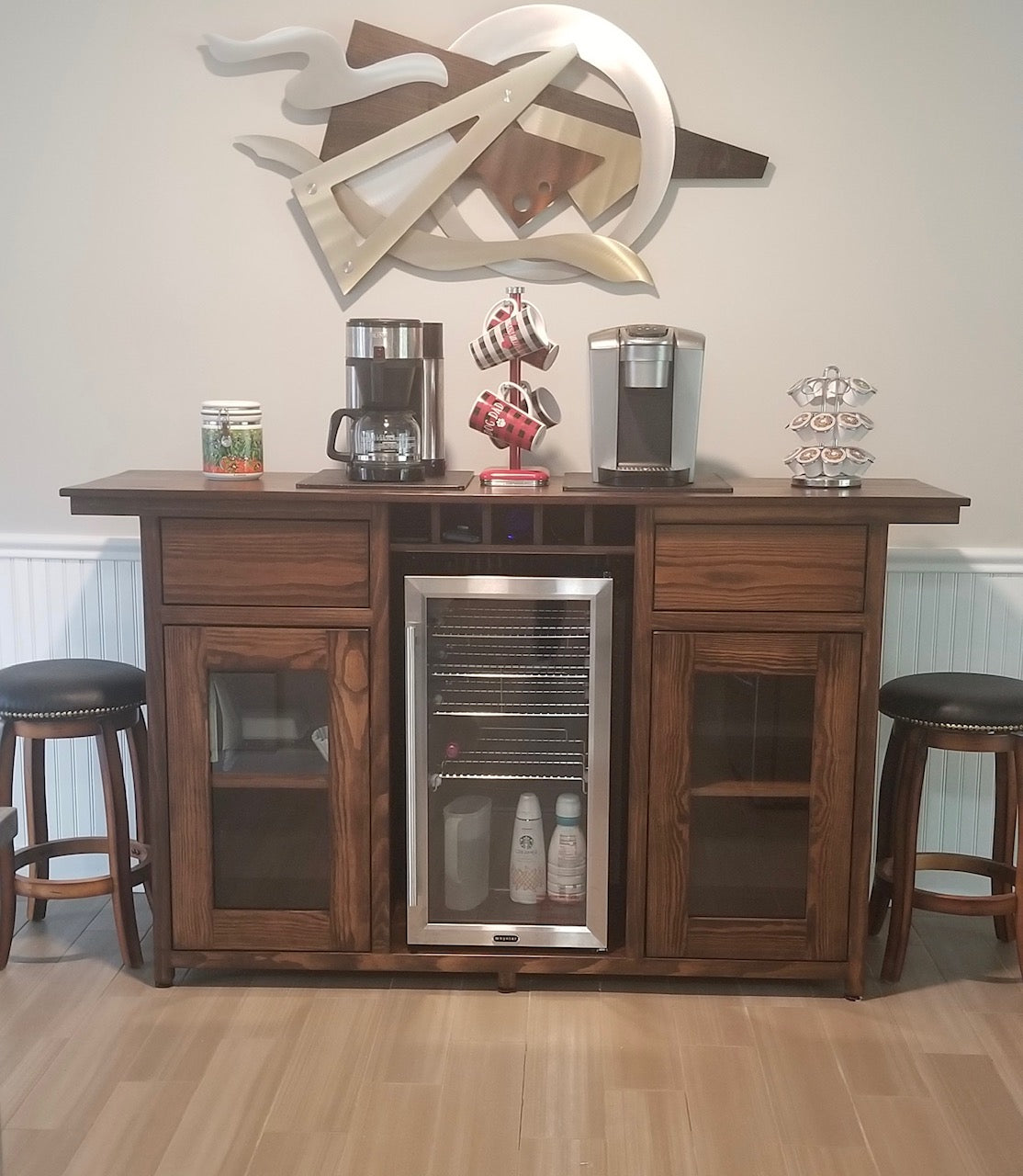 Custom sideboard/cabinet designed to accommodate a small refrigerator.
